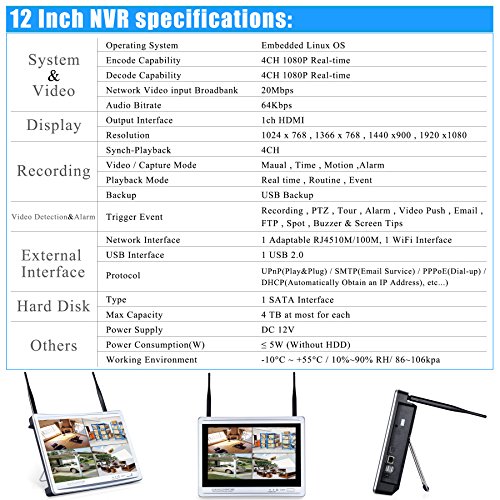 ▲ 12'' wifi monitor 1080P cameras are built in 24pcs infrared LEDs that allow night vision distance visible up to 49feet in total darkness and with 3.6mm lens give you wide angle view