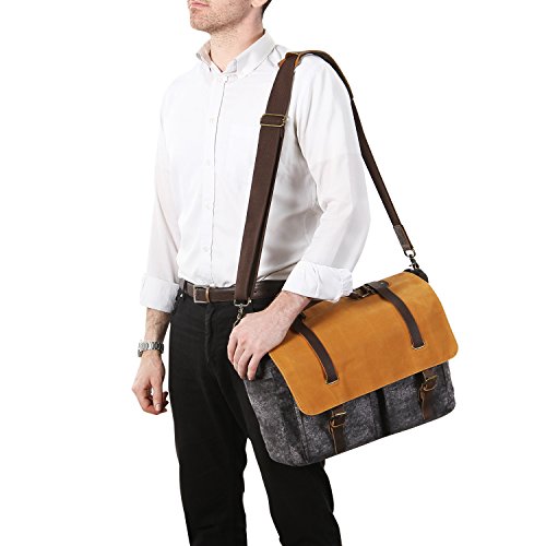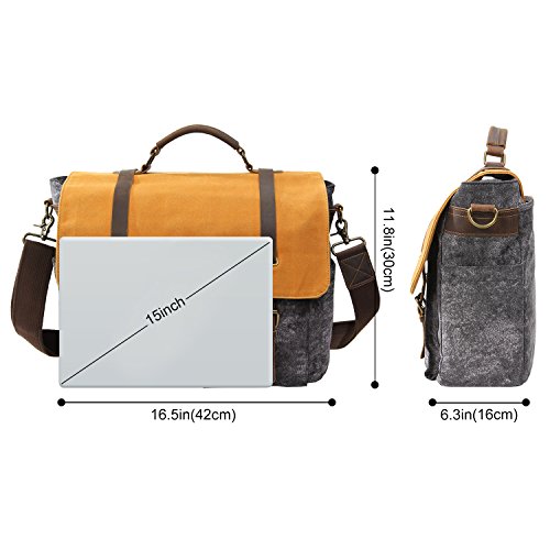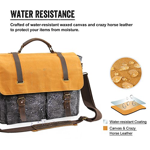 -. Feature : PREMIUM MATERIALS: The exterior of the messenger bag is constructed of premium crazy horse leather and water-resistant waxed canvas to keep moisture out of your bag. Its interior is crafted of pure cotton fabric with reinforced strong seams for added strength and durability. / LAPTOP POCKET: The main compartment features a laptop sleeve(16 x 10 x 2in) that can fit most laptops like macbook pro up to 15" in size. Compared with other messenger bags, its laptop sleeve is padded with anti-collision isolation foam which provides protection for your laptop against impacts and shocks. Note: Please check the size of your laptop before purchasing. / MULTI-PURPOSE POCKETS: The multi-pocket design houses everything you need for your travel, business work or school study. The main compartment is designed with 2 interior zipper pockets and 2 slip pockets to hold your wallet, credit cards, bank cards, power bank and cellphone. Additionally, there are two front pockets and 1 back magnetic pocket that provide extra space to store your documents and frequently used items like eye glasses and keys. / PORTABILITY & CONVENIENCE: This waxed canvas messenger bag comes with a carry handle and an adjustable shoulder strap with moving pad to offer multiple carrying ways, and also helps you relieve pressure. For your convenience, the flap is equipped with magnetic snaps that allow for easy access to your stored items. / PRODUCT DIMENSIONS: The overall dimensions of the water-resistant canvas messenger bag are about 42x30x16cm. Due to its multi-pocket design and classic style, the messenger bag is suitable for students, office workers and travel enthusiasts.