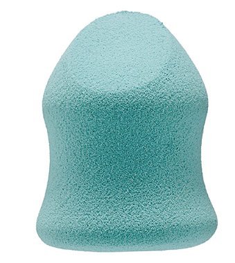 - A teal colored, ergonomically designed makeup sponge