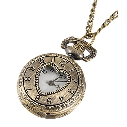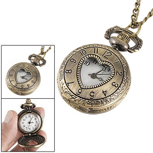 Product Description Cut Out Heart Hunter Case Necklace Pocket Watch Bronze Tone For Ladies . * Hollow Out Heart Round Hunter Case, Floral Back Case, Arabic Numbers Dial. * With knob button for adjustable times. * Wonderful gift for ladies 0
