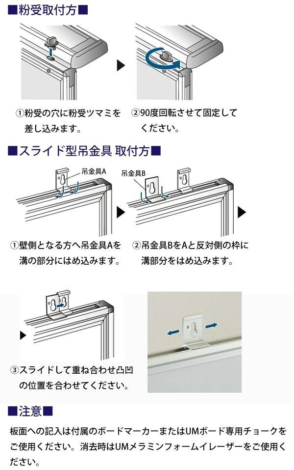 | 付属品 | UMメラミンフォームイレーザー ボードマーカー(赤・黒)各1本 マグネット×2個 粉受取付金具 スライド型吊金具 |