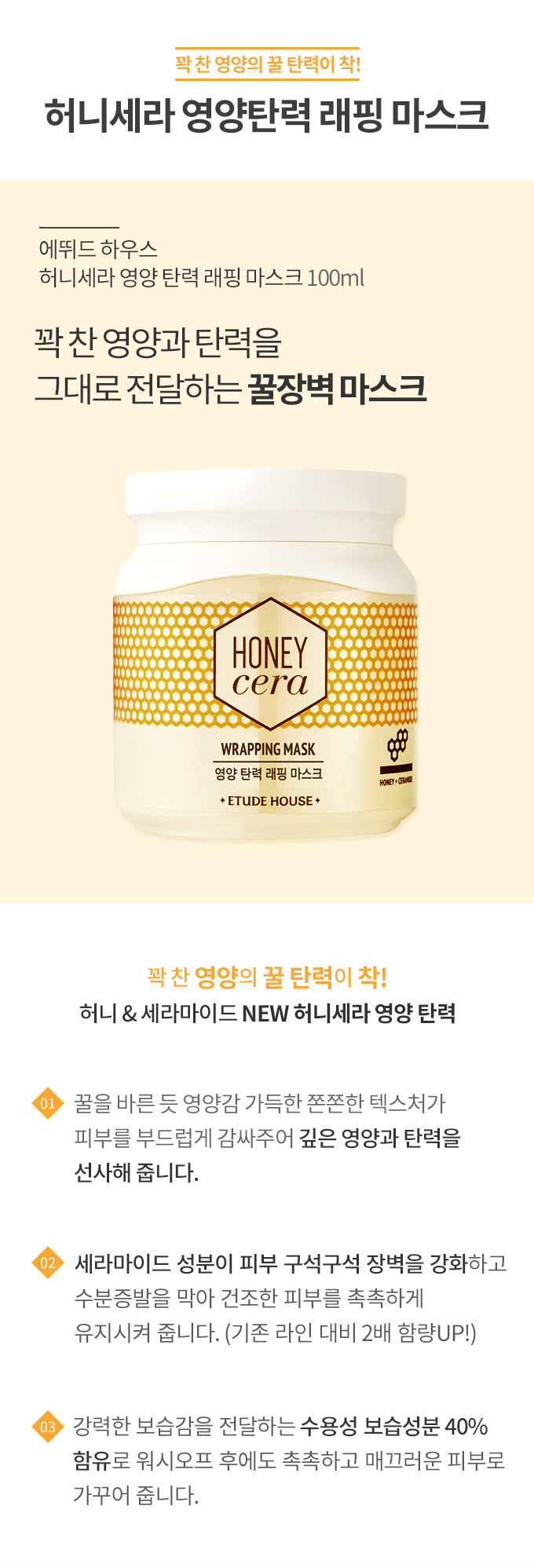 蜂蜜を塗ったようにヨウンヤンガムいっぱいチョンチョンハンテクスチャが肌を優しく包んでくれ、深い栄養と弾力をプレゼントします。