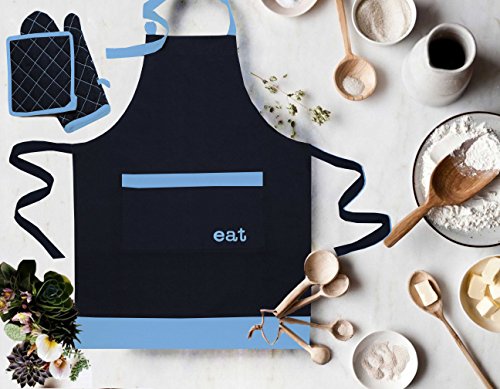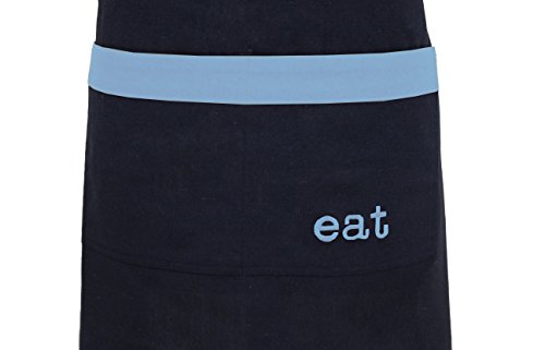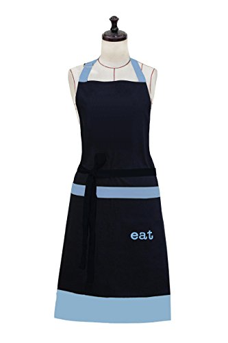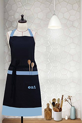 Milano Home "Eat" Embroidered 100% Cotton Professional Apron for Men & Women with Adjustable Neck & Centre Pockets Perfect for Cooking BBQ Baking Full in Length - Blue