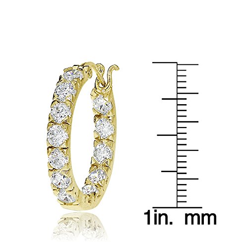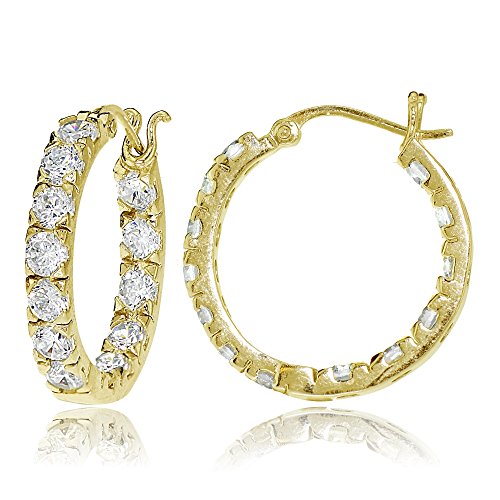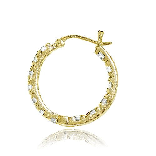 These chic round hoop earrings feature sparkling 3mm cubic zirconia stones, prong-set in 25mm gold tone over sterling silver hoops. The stones are strategically set facing forward on the inside and outside of the hoops, so that they can be seen from the front. The hoops are secured by post with snap-down backs.
