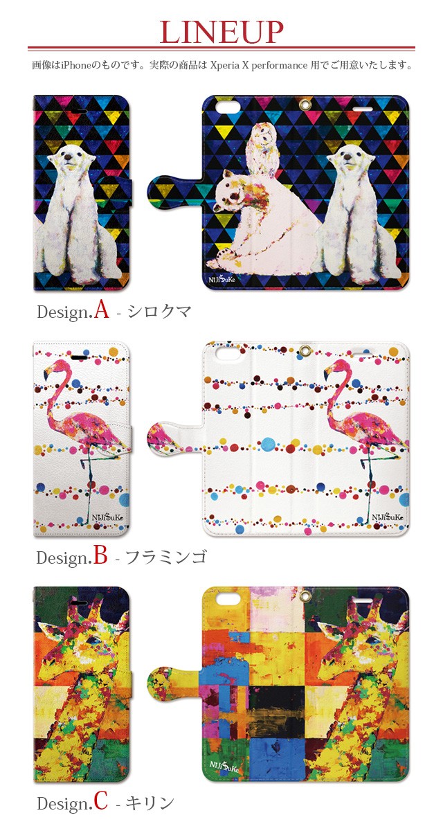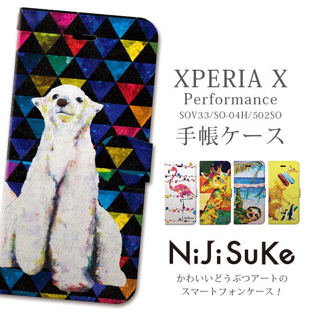 ■対応機種Xperia X performance型番名 : SO-04H(ドコモ)/SOV33(au)【!】購入前にご確認ください※同じシリーズでも種類がたくさんございますので対応機種の型番にお間違いがないよう、ご注意下さい。対応機種のお間違いによる返品、交換は受けかねます。予めご了承下さいませ。■素材PUレザープラスチック(ポリカーボネート)■ Xperia エクスペリア えくすぺりあx performance SO-04H SOV33 docomo sov33カバー カバーso04h sov33手帳型ケース カバーso04h■手帳型手帳 手帳型ケース 手帳カバー 手帳型スマホケース マグネット ベルト ベルト付き レザー icカード カード カード収納 カードホルダー Suica ストラップホール閉じたまま通話■NiJiSuKe ニジスケ にじすけおしゃれ かわいい 可愛い おしゃれかわいい 絵画 動物 アニマル カラフルペンギン 鳥 フラミンゴ キリン しろくま シロクマiphoneカバーキリン■その他Xperia X Performance SO-04H SOV33 エクスペリア 手帳ケース ソニー SONY Android 手帳型ケース どうぶつ 動物 イラスト アート 絵画 アクリル画 NiJiSuKe ニジスケ スマホケース 携帯ケース