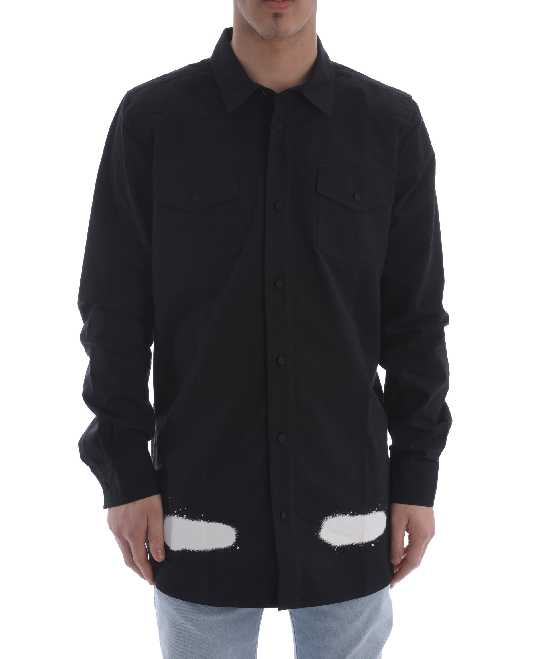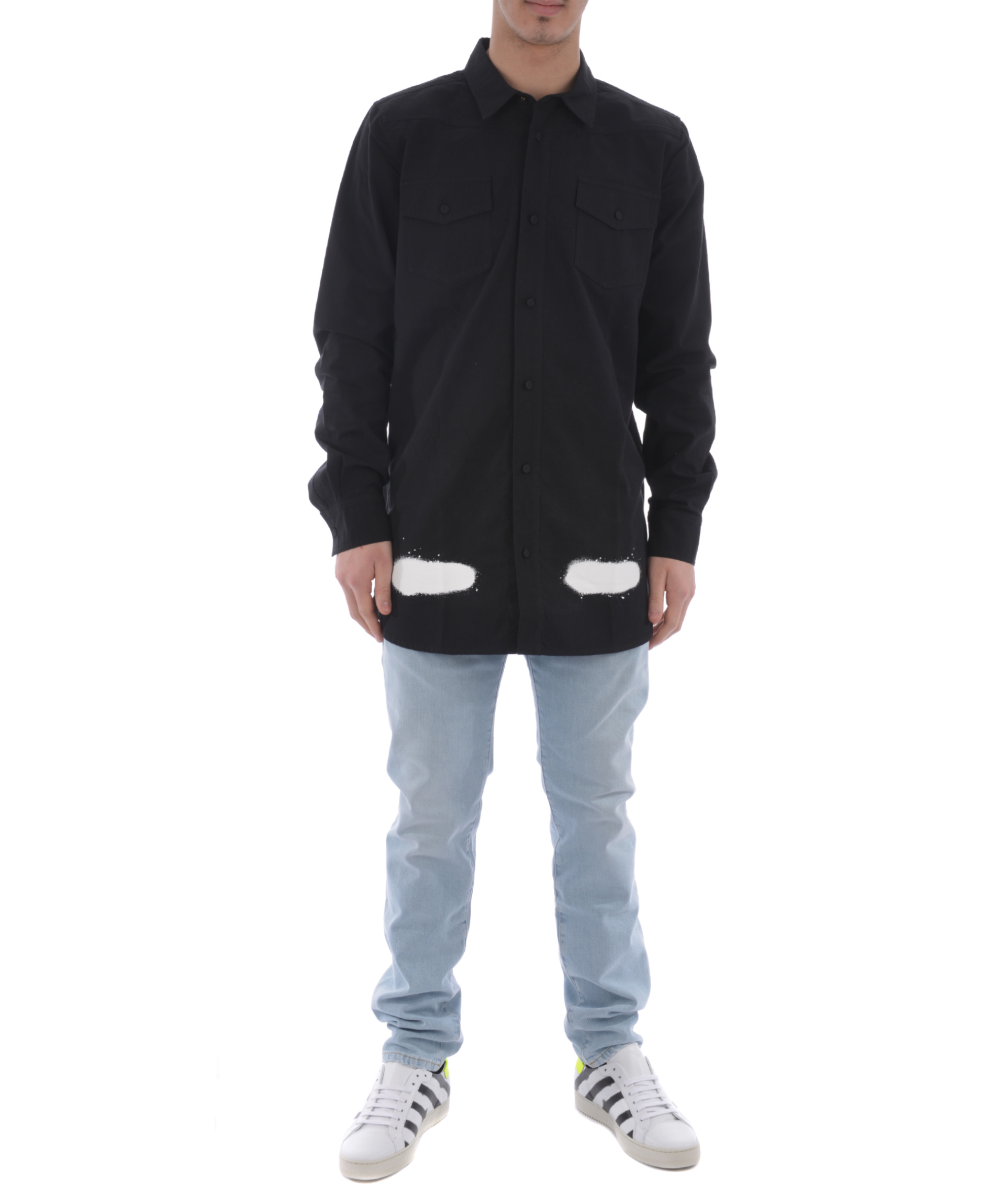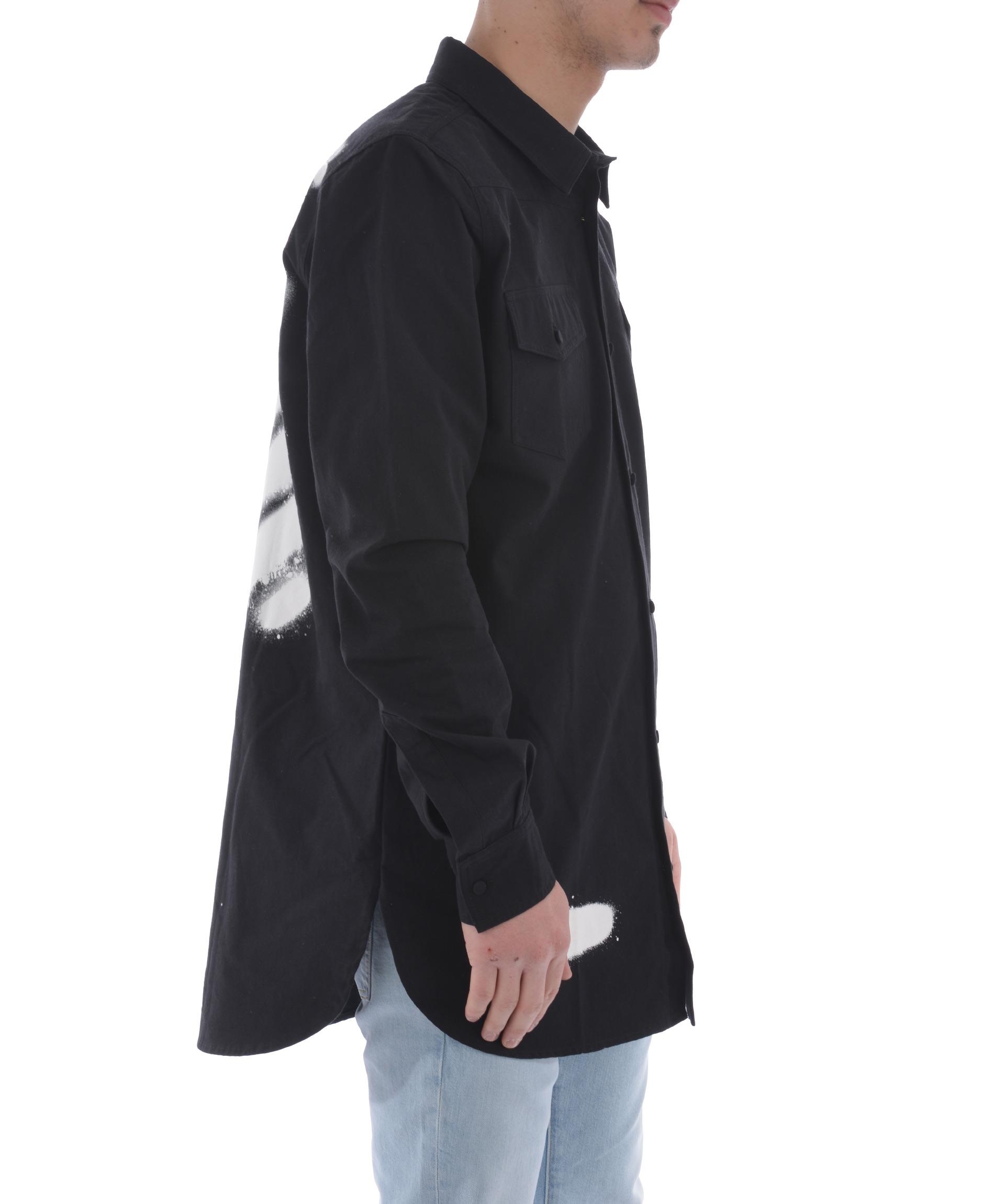 Diagonal Stripes Jacket from Off-White: Black Diagonal Stripes Jacket with a baggy cargo front pocket, a button closure and buttoned handcuffs.