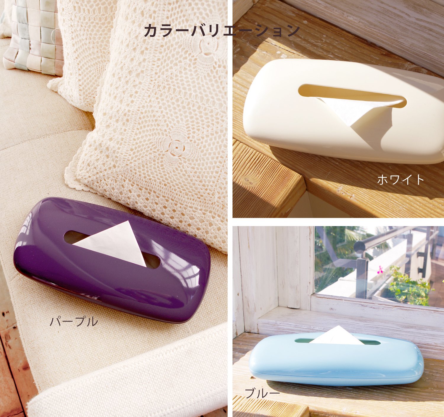 It is a case for refilling a tissue box that fits in any room with a rounded design and shiny glossy feeling.