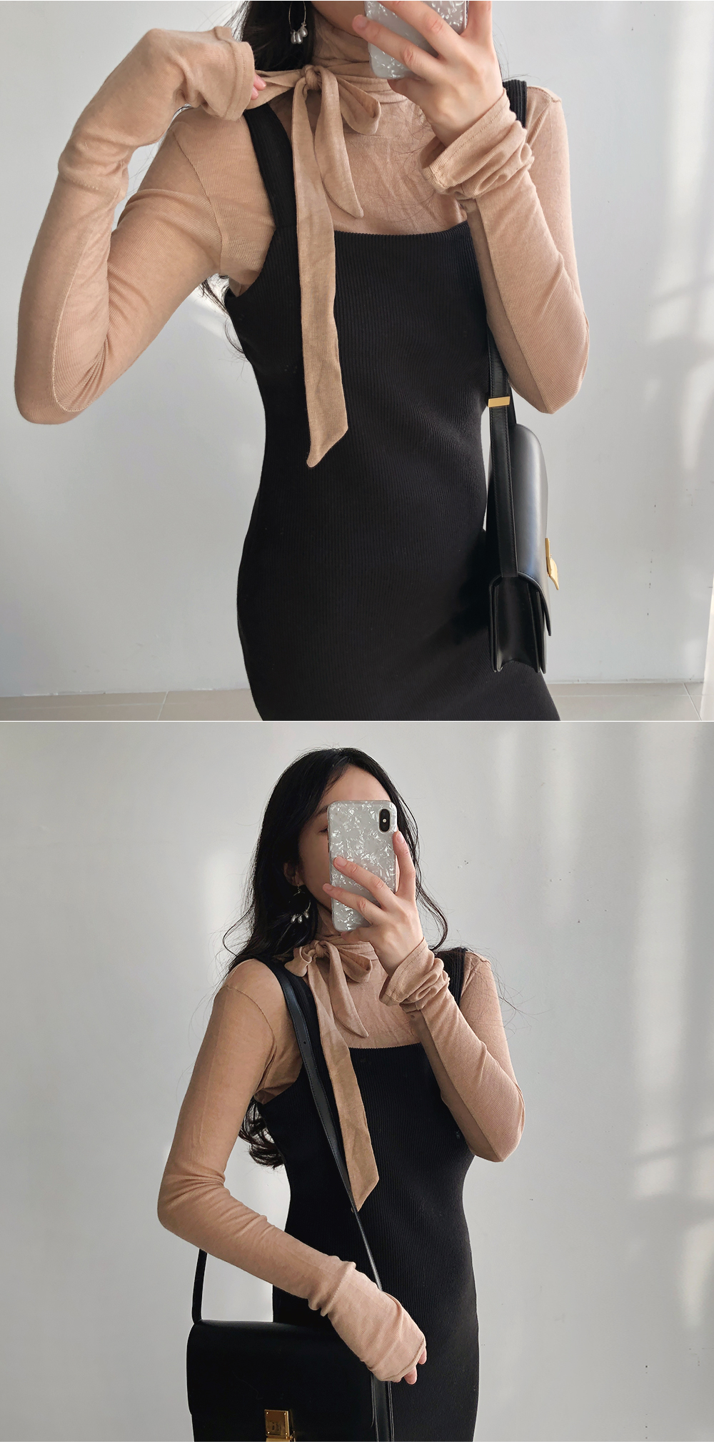 리본 머플러 슬림 폴라 티셔츠
