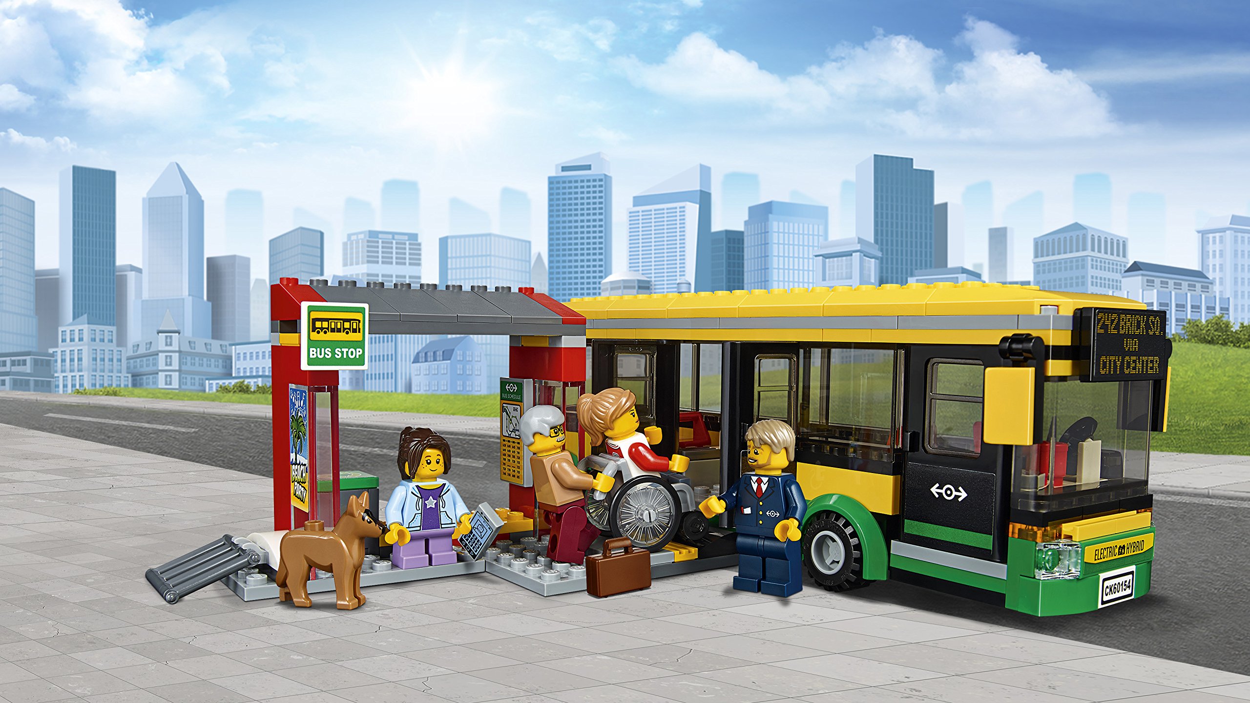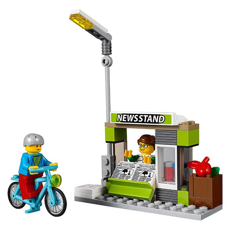 Take the bicycle and head to the bus stop! Let's stop the bicycle and buy a cold drink and a magazine.
