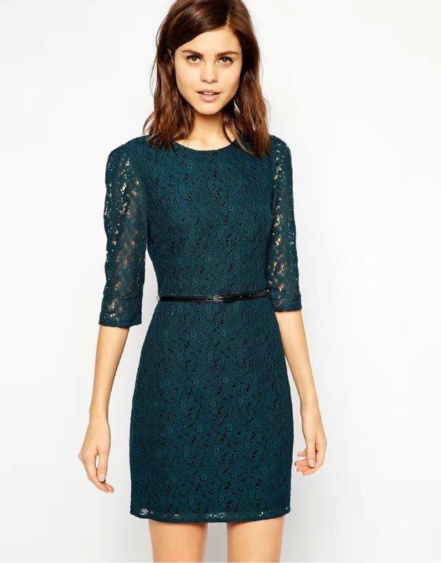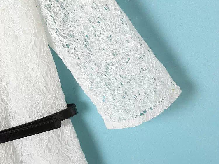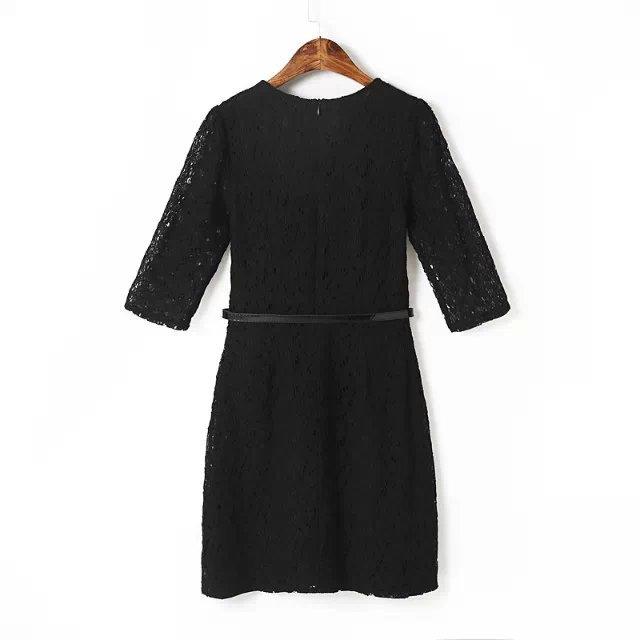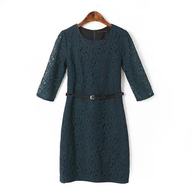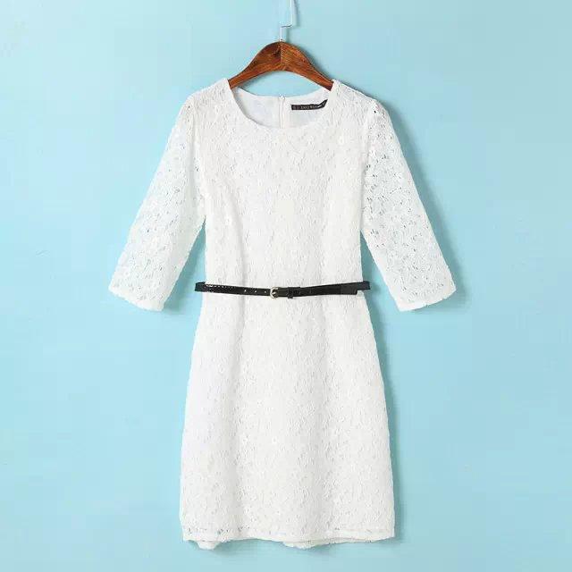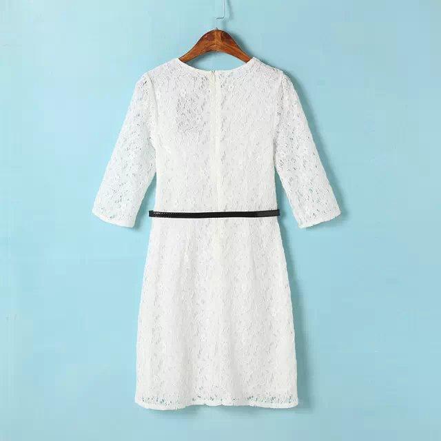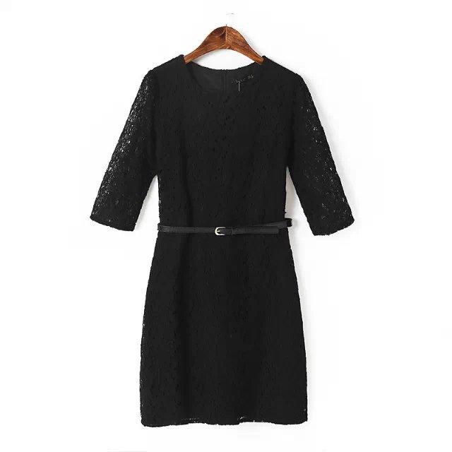 Spring New Solid Embroidery Lace Vestidos Half Sleeve O Neck Pullover Belted Pencil Dress Slim Elegant OL Work Women Dress