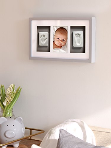 Includes no mess impression material, rolling pin, clay shaping ruler, gray background, and hanger for easy wall mounting. Photo frame comes in gift ready packaging.