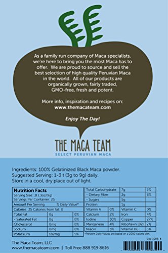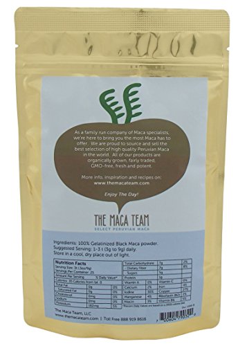 Black Maca root powder is the rarest and most valued of all three colors of Maca. Ours is made from 100% Black Maca roots grown on an organic farming co-op in a remote pristine part of the Peruvian Andes. Gelatinized Black Maca has been pre-cooked to dissolve most starch content and ease digestion. It takes about 4 kg of Raw Maca roots to produce 1 Kg of Gelatinized Maca powder. Research has found Black Maca to have some important properties among all Maca colors. A 2009 study in Peru found Black Maca to be the best for increasing sperm count and motility as well as for boosting male libido. A Swiss study from 2010 showed Black Maca to excel at protecting bone structure and preventing osteoporosis. 2 studies from China in 2006 and 2011 found Black Maca to be superior for increasing memory, concentration and learning. And a UK study from 2011 found that Black Maca supported muscle growth. We generally recommend Black Maca for men looking to increase libido and performance, for students looking to boost mental sharpness and for anyone working to increase muscle size or athletic performance. Black Maca is a nutritional powerhouse, containing nearly all essential amino acids and free fatty acids, significant levels of vitamins A, B1, B2, B3, and C, a high concentration of bio-available protein and nutrients unique to Maca called macaenes and macamides. The Maca Team, LLC is dedicated to preserving and sharing high quality Peruvian grown Maca with the world. As a family run company of Maca specialists, we're here to bring you the most Maca has to offer. We are proud to source and sell the best selection of high quality Peruvian Maca in the world. All of our products are always organically grown, fairly traded, GMO-free, fresh and potent. We sell 8 different kinds of certified organic Maca, raw and gelatinized (pre-cooked), in a variety of sizes, in vegan capsules and extracts. Please see our seller profile for more details. Thanks for considering The Maca Team!Feature
