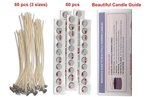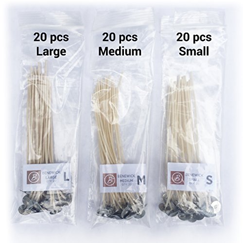 - Benewick Offers a Sample Pack Of 3 Different Wick Diameter Sizes To Avoid Candles Which Don’t Burn Properly. INCLUDES: 60 wicks (20 Small, 20 Medium, 20 Large), 60 stickers, Instructions.