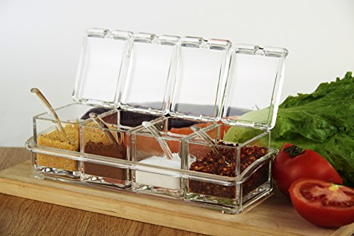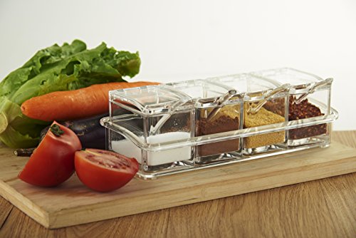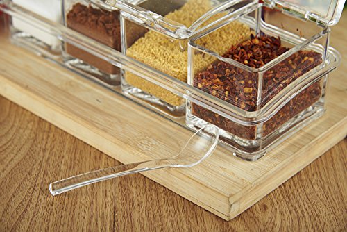 -. Feature : Made by Premium Acrylic.Sturdy,Damp proof,Corrosion resistance,cold-proof and heat-proof,easy cleaning / Elegant design and excellent quality and well received by the user's favorite. / 4 spoons came with the jar / It can contain all kinds of condiments,Such as salt, pepper, sugar, aginomoto etc / Quality is the core business.If you have any questions or advice to the item,Please contact us freely.we will answer you at the first time.