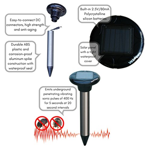 - Sonic Pulses Against Burrowing Rodents: Vekibee Solar Sonic Mole Repeller vibrates and emits 400 HZ low-frequency sonic pulses every 20 seconds to repel burrowing rodents. The vibrations and sonic pulses are harmless to human, pets and environment.