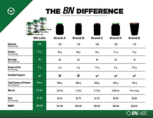 PREMIUM PLANT BASED PROTEIN: Forget about cheaply made protein powders which include ingredients of questionable quality. BNLABS presents you with the best vegan protein powder which is the result of a proprietary blend of plant based proteins. Every ingredient in the non-GMO, USDA-ORGANIC, gluten, dairy, soy and lactose free mix is 100% organic, including Pea Protein Isolate, Brown Rice Protein, Hemp Protein, Spirulina Powder, Guar Gum, Natural Flavors, Stevia, & Coconut Cream.