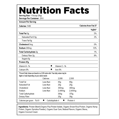 The Protein Blend (Organic Pea Protein Isolate, Organic Brown Rice Protein, Organic Hemp Protein, Organic Spirulina Powder), Organic Guar Gum, Natural Flavors, Organic Stevia, Organic Coconut Cream mix is an excellent source of amino acids, BCAA's and glutamine.