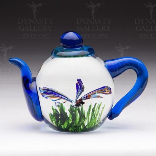 -. Title : T-pot Teapot Glass Unusual Paperweight Art Glass 3.5" Cobalt Rainbow Butterfly Glow