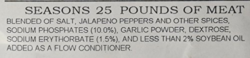 14 oz.Bag. Ingredients: Salt, Jalapeno Peppers and Other Spices, Sodium Phosphates (10.0%), Garlic Powder, Dextrose, Sodium Erythorbate (1.5%), and less than 2% Soybean Oil added as a flow conditioner