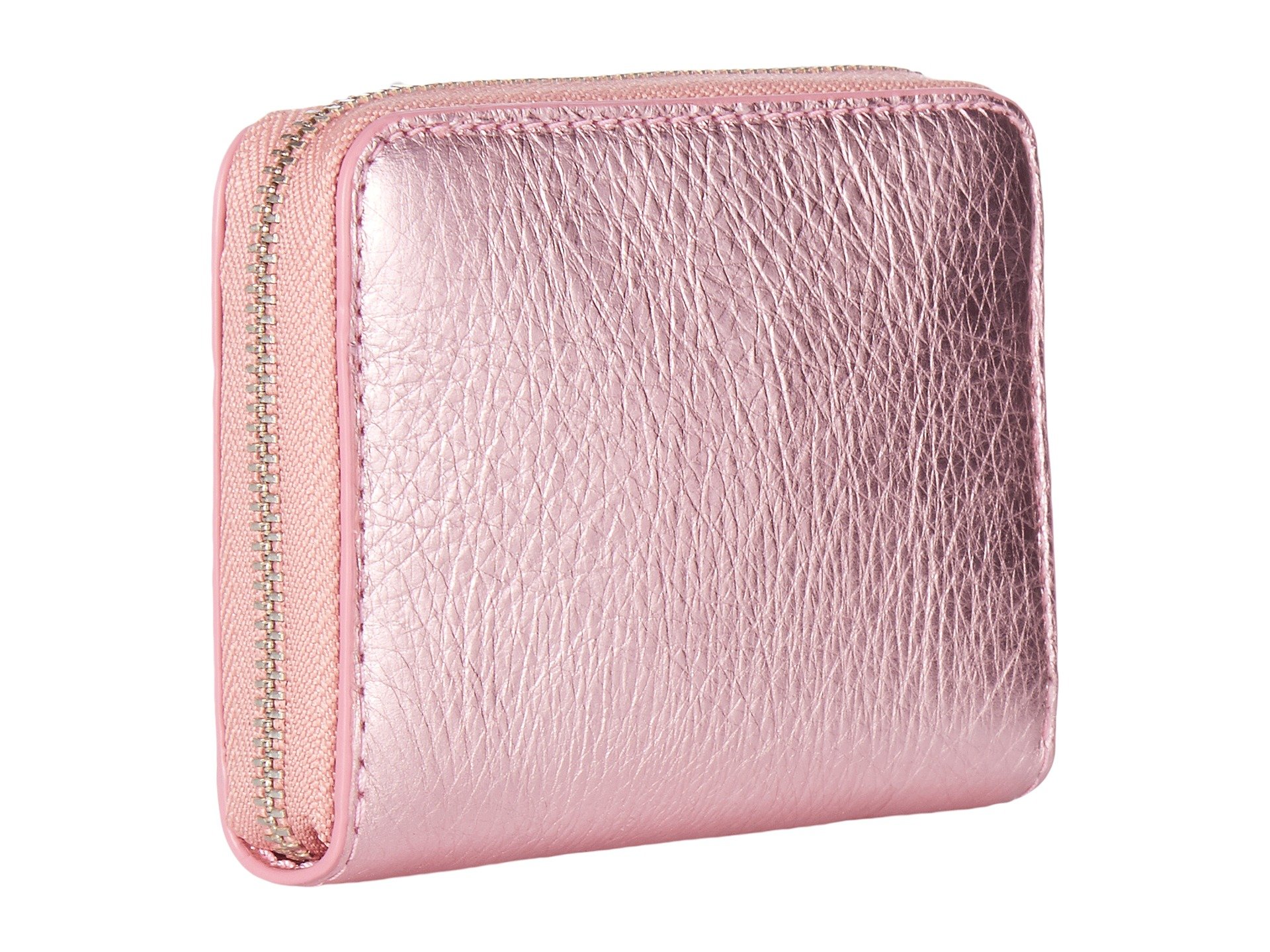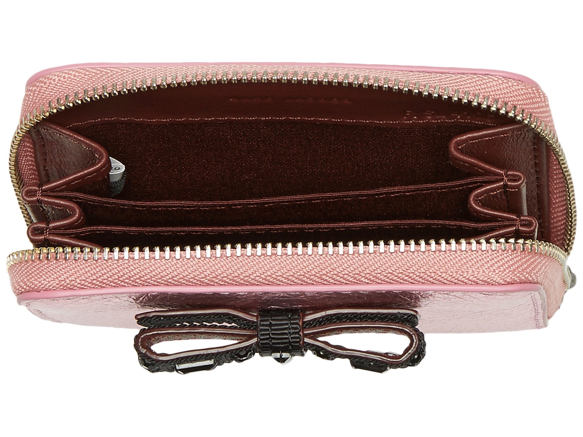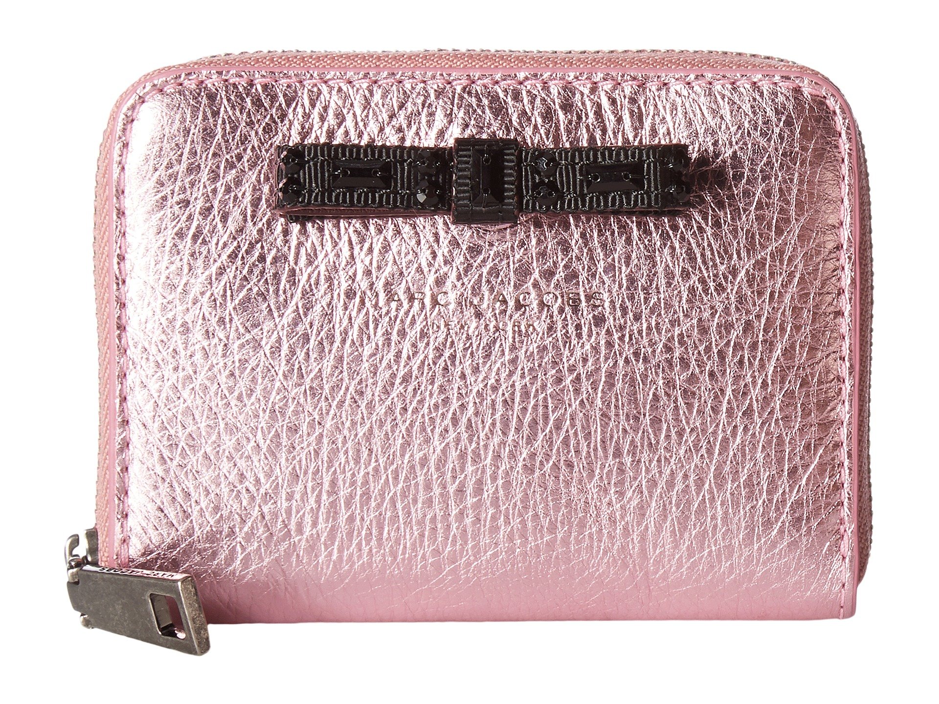 | Product Information SKU: #8822253The day is yours with the Marc Jacobs™ Metallic Bow Zip Card Case.Textured leather pouch.Metallic, zip-around closure. Decorative bow detail in the center.Lined interior accordion slide pockets through the center.Imported.This item may ship with an attached security tag. Merchandise returned without the original security tag attached or a damaged tag may not qualify for a refund.Measurements: Bottom Width: 4 in Middle Width: 4 in Top Width: 4 in Depth: 1?2 in Height: 3 in Weight: 2.6 oz |