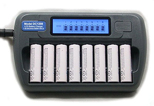 -. Binding : Electronics -. Brand : Battery Chargers -. EAN : 0762770556575 -. Feature : Charges 1 to 8 AA or AAA batteries at the same time. Charges NiMH or NiCd batteries in any combination. / Independent charging channel for each battery. State of the art microcontroller for optimum charge each time. Full charge -dV detection. Safety timer control function. Reverse polarity detection / Short circuit detection and over temperature detection. Auto detection of non-rechargeable battery or defective battery. Refresh function is very helpful for NiCd batteries. / Battery sizes and types: AA and AAA NiCd and NiMH rechargeable. Input voltage 12 Vdc, 1.0A max. Input voltage for ac/dc adapter: 100 to 240Vac, 50 or 60Hz / Channel output: AA 1.2V 500 mA, AAA 1.2V 250 mA. Discharge current 250 mA. Batteries not included. -. Label : Battery Chargers -. Manufacturer : Battery Chargers -. PackageQuantity : 1 -. ProductGroup : Speakers -. ProductTypeName : BATTERY -. Publisher : Battery Chargers -. Studio : Battery Chargers -. Title : 8 Slot 8 Bank Fast LCD Battery Charger AA AAA NiMH NiCd with Refresh Black -. UPC : 762770556575