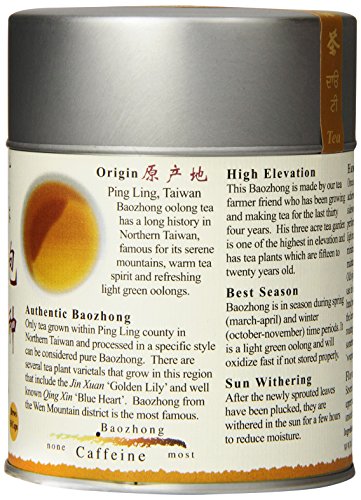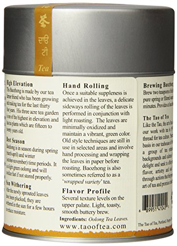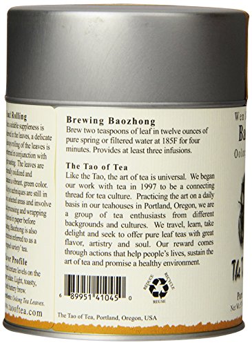 -. Binding : Grocery -. Brand : The Tao of Tea -. EAN : 0689951410450 -. Feature : Pack of two, 2-ounce (total of 4-ounce) / Low oxidized / Pure leaf tea -. Label : The Tao of Tea -. Manufacturer : The Tao of Tea -. NumberOfItems : 2 -. PackageQuantity : 2 -. ProductGroup : Grocery -. ProductTypeName : GROCERY -. Publisher : The Tao of Tea -. Size : 2 Ounces -. Studio : The Tao of Tea -. Title : The Tao of Tea, Baozhong Oolong Tea, Loose Leaf, 2.0-Ounce Tins (Pack of 2) -. UPC : 689951410450