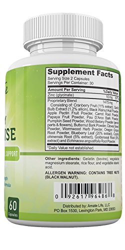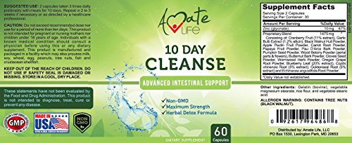 -. Feature : 10 DAYS PROGRAM: if you are looking for a fast and easy way to perform a deep and healthy cleanse on your body without damaging any of your organs, the Amate Life 10 Day Cleanse capsules are perfect for you! All you need is a few pills every day for no more than 10 days. / 100% SATISFACTION GUARANTEED - We want you to be completely satisfied. If you are in any way dissatisfied we'll refund your money. No questions asked! This product is formulated in the USA, GMP certified and Non-GMO so you should never worry about quality standards. Also, our supplement doesn't contain any preservatives or artificial colors, so it's just pure health! / ESSENTIAL INGREDIENTS: Our deep cleansing treatment contains a mix of the most powerful ingredients nature has to offer: from black walnut hull, to wormwood, cloves and papaya, this cocktail is made specially to help your intestines clear up and perform better. / WHY IT'S IMPORTANT: Detoxifying your body may be fashionable nowadays, but it's also one of the best ways to help your body get rid of all the toxins it has accumulated in time. Give your body a boost and you will feel like a new self! / ALL FOR DIGESTION: If you have problems with your stomach or intestines or you just can't seem to get rid of some extra pounds, then maybe the accumulating toxins are finally starting to show. Choose better for your digestive system and help it recover with the 10-day cleanse.