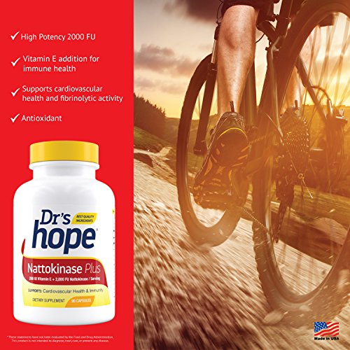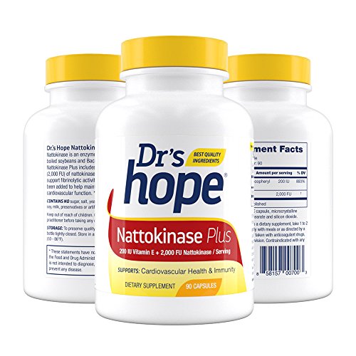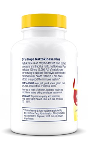 Dr's Hope Nattokinase Plus combines both Nattokinase and Vitamin E for all-around circulation support. Nattokinase is an enzyme derived from the traditional Japanese soy food "natto." The nattokinase is in a concentration of 2,000 FU per serving to support fibrinolytic activity and cardiovascular health. Nattokinase PLUS includes Vitamin E, this additional bonus provides an antioxidant which supports the immune system, in addition to cardiovascular function, blood pressure, and cholesterol levels.