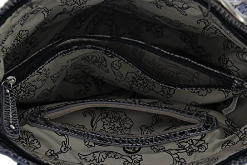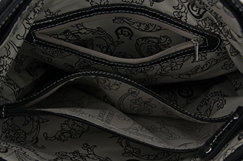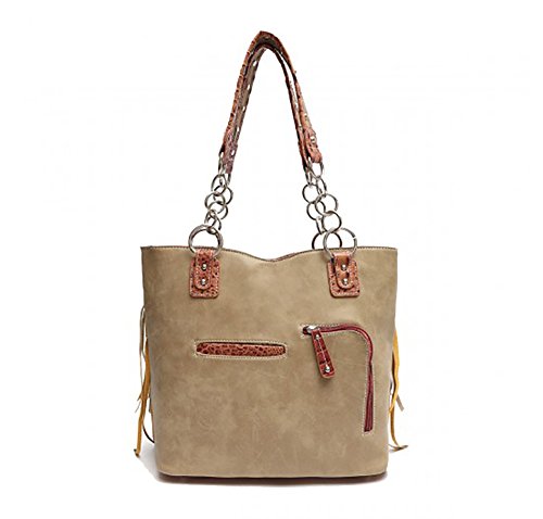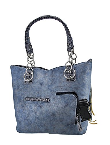 -. Brand : Cowgirl Trendy -. Department : womens -. Feature : Cowgirl trendy western tote bag is made of imitation leather with fabric lining on the inside / Two rows of two-tone graduating fringe with a blue bead and silvertone hardware on the front; zip top closure / One secure zippered pocket on the outside (for a conceal carry gun) 6 inch tall x 7 inches long can also be used fit a 5 inch smartphone and one open pocket in back / Fabric lined interior contains one wall zipper and a split compartment with mid zipper / 12.75 inches long by 12.5 inches tall by 5.5 inches wide; double handle with chain -. ProductGroup : Shoes -. ProductTypeName : HANDBAG -. Title : Cowgirl Trendy Western Fringe Tote Handbag Concealed Carry Purse