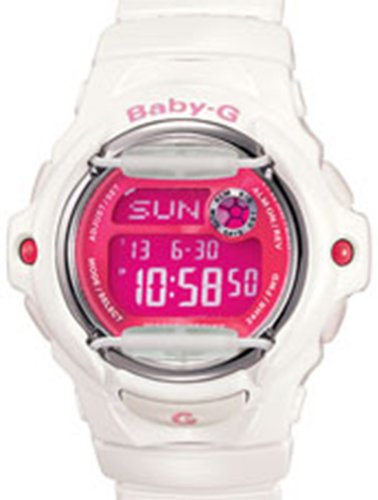 The Baby-G from G-Shock was designed specifically for women. It features a backlight, countdown timer, multiple alarm settings, and a calendar. The watch also features world time, 29 different time zones, and is water resistant to 100m. Dimensions: Case Width: 41mm Case Length: 38mm Band Width: 19mmFeature