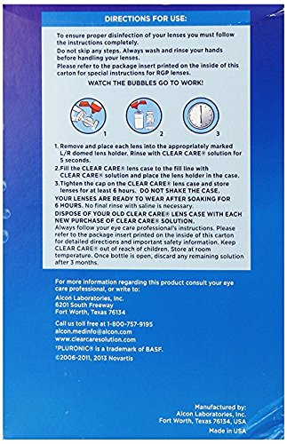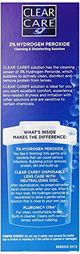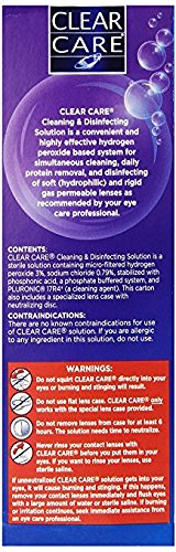 Studio : Alcon Laboratories Inc Publisher : Alcon Laboratories Inc Binding : Health and Beauty Product Description For contact lenses so fresh, they feel like new, the clear choice is one-bottle clear care cleaning disinfecting solution. Clear care has a unique triple action cleaning process that you can see working, different from multipurpose solutions, that is simple and easy to use. Clear care, with no added preservatives that may irritate eyes, uses hydrogen peroxide that penetrates the lens and kills germs and bacteria for strong disinfection and deep cleaning. After the hydrogen peroxide provides deep cleaning, a built-in cleaning agent loosens dirt, debris and deposits. Practitioner instructions may differ. See package insert for complete instructions. 0