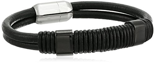 Men's Black Genuine Leather and Black Rubber with Stainless Steel Clasp Bracelet, 8"x 0.5"