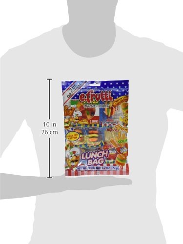 -. Binding : Grocery -. Brand : E.Frutti -. EAN : 0813805002298 -. Feature : Gummy Mini School Lunch Bag - 2.7 Oz Bag / Soft & Yummy, Looks Like a Real Thing! / Fun mix of Gummy Hamburgers, Sour Gummy Fries, Gummy Cola Bottles, Gummy Hot Dog and Gummy Pizza / Bag Net Wt. 2.7 oz (77g) / Bag contains an assortment of 7 individually wrapped gummy lunch candy -. IsAdultProduct : 0 -. Label : E. Frutti -. Manufacturer : E. Frutti -. Model : BCG54249 -. MPN : BCG54249 -. NumberOfItems : 1 -. PackageQuantity : 1 -. PartNumber : BCG54249 -. ProductGroup : Grocery -. ProductTypeName : GROCERY -. Publisher : E. Frutti -. Studio : E. Frutti -. Title : Original Mini Gummy School Lunch Bag - 2.7 Oz (Gluten Free ~ Nut Free) -. UPC : 813805002298