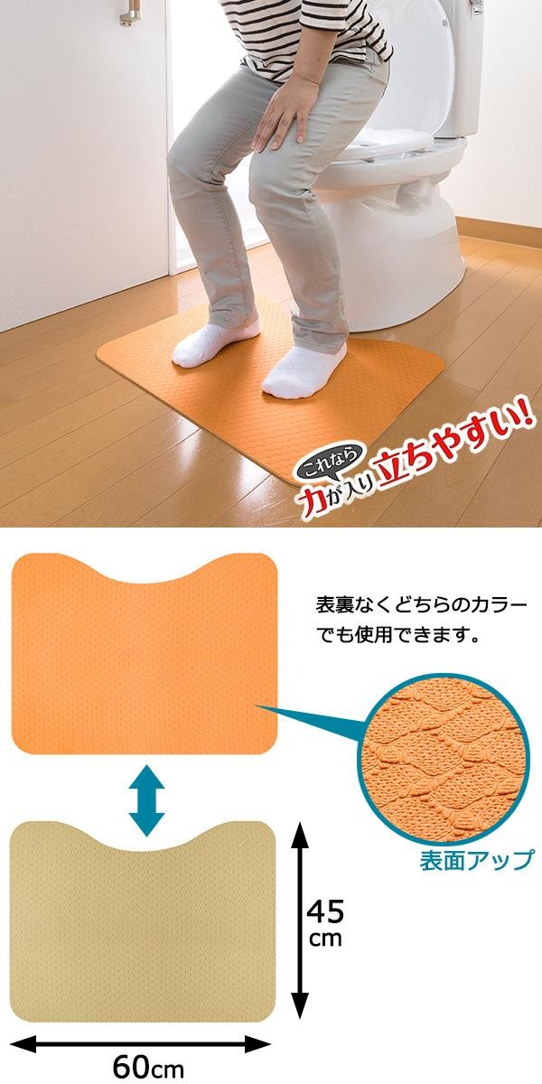 | トイレで立ち上がる時、すべり止め効果があり、足元がすべらず楽に立ち上がれます。ソフトな足ざわりで、適度なクッション性があります。マットには裏表がなくどちらのカラーでも使用できますので、周囲が反ってきた時は裏返して使用して下さい。 |