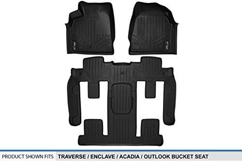 -. Brand : MAXLINER -. Color : Black -. EAN : 0608938389282 -. Feature : Please Check Description for Fitment. / Textured Surface. / Protects the underneath of your floor mats by avoiding spills or dirt from going under thanks to its raised and strengthened lip. / Top of the line technology that gives your interiors a first class look. / Lifetime Warranty. -. Label : MAXLINER -. Manufacturer : MAXLINER -. ManufacturerPartsWarrantyDescription : Parts -. MPN : A0043/B0044 -. PackageQuantity : 3 -. PartNumber : A0043/B0044 -. ProductGroup : Automotive Parts and Accessories -. ProductTypeName : AUTO_ACCESSORY -. Publisher : MAXLINER -. Studio : MAXLINER -. Title : MAXFLOORMAT Floor Mats for Traverse / Enclave / Acadia / Outlook Bucket Seat (2007-2016) Complete Set (Black) -. UPC : 608938389282
