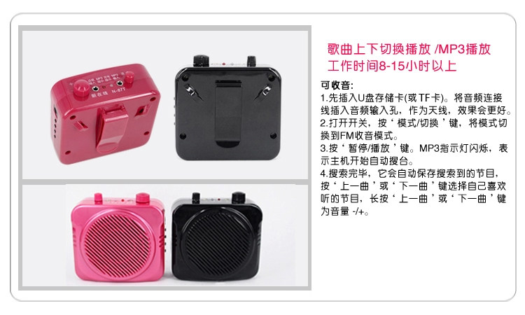 A: This is a machine with FM radio function, the MP3 audio cable insertion hole stretch, turn on the power switch, press the mode switch button on the microphone in the radio hear noise release, and then tap the middle play to enter the automatic station search, end search platform approximately 1-2 minutes, press the arrow keys to change channels on it, specifically to receive the number of channels, depending on how much of the strength of local FM stations and signals, if it is in use within the building, as close to a window or outdoors better signal.