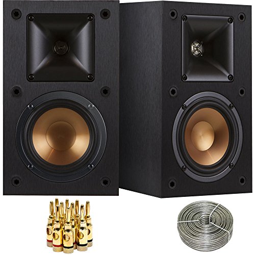 Klipsch R-14M Reference Bookshelf Monitor Speakers Bundle includes Speaker Pair (2 Speakers), 100ft of Select Series 16AWG Speaker Wire and 5-Pair Brass Speaker Banana Plugs Open Screw Type