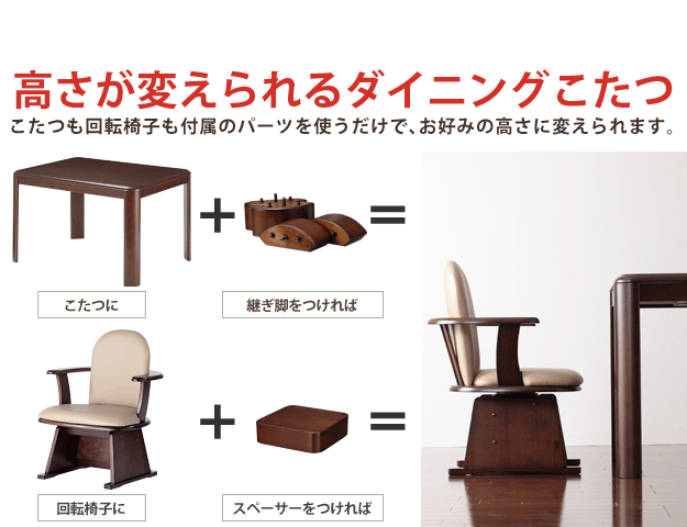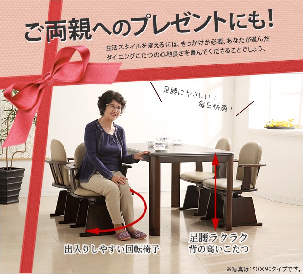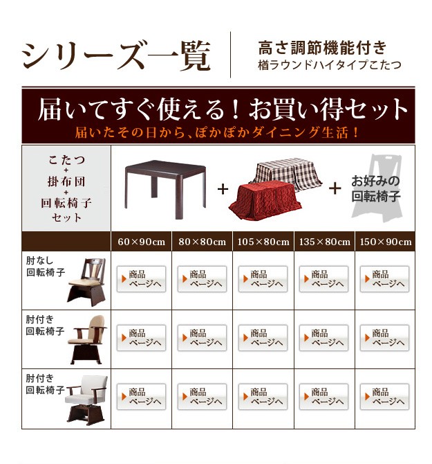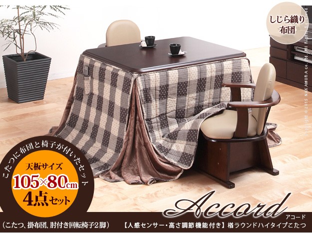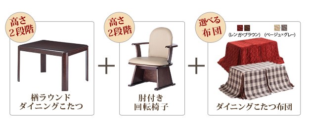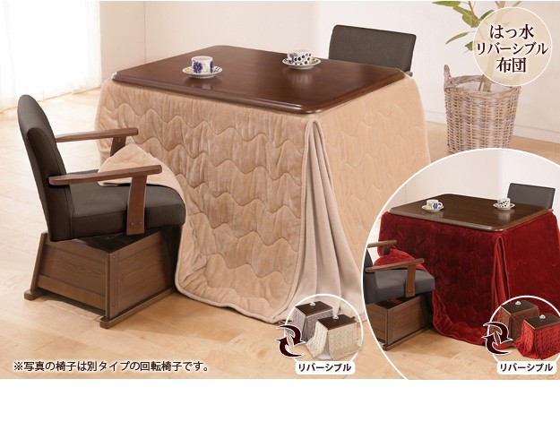 セット内容:こたつx1台、こたつ布団x1枚、肘付回転椅子x2脚