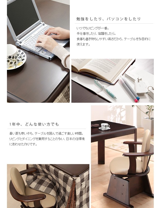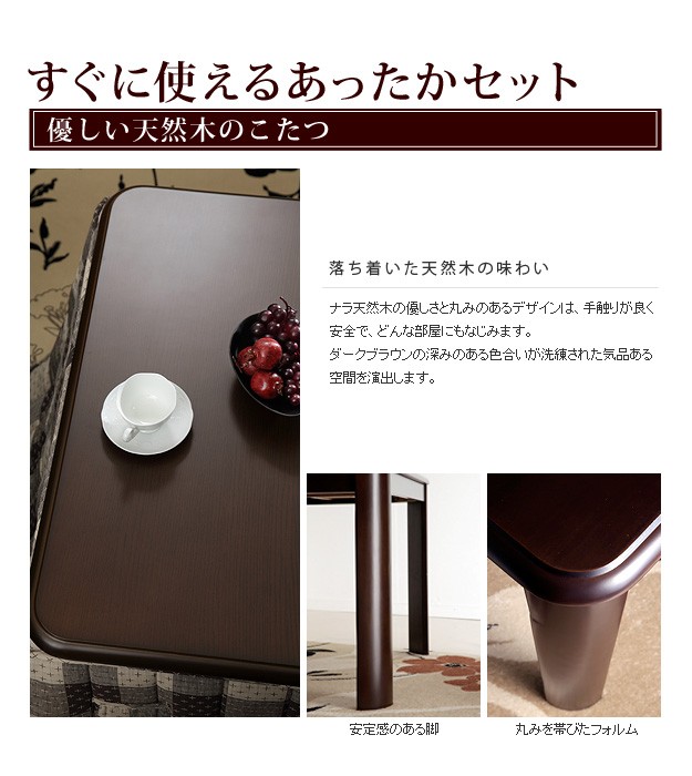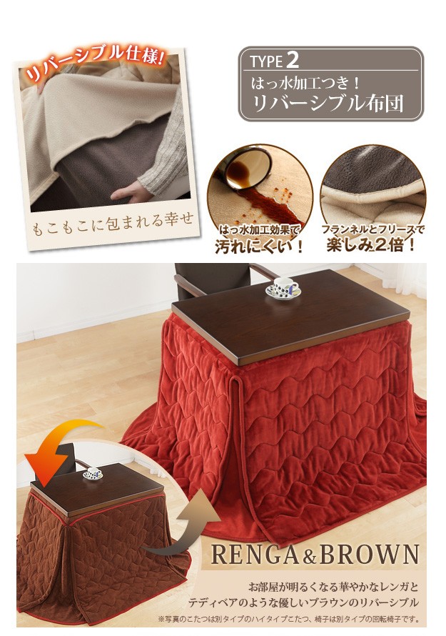 材質:こたつ天板-天然木化粧繊維板(楢)、こたつ幕板・脚部-天然木(ラバーウッド)、椅子本体-天然木(ラバーウッド)、布団表地-しじら/綿100%、レンガ・ベージュ/ポリエステル100%(撥水フランネル)