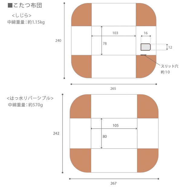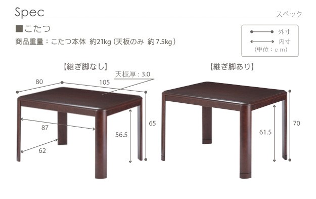 サイズ(cm):こたつ-幅105x奥行80x高さ70(65)・約21kg、椅子-幅58x奥行53.5x高さ78(73)・約12kg、布団-265x240cm・中綿量約1.15kg