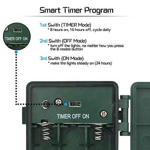 Smart Timer Progarm ? One Switch Three Modes - Choose what you want. - First Mode (TIMER) : 6 hours on, 18 hours off, auto cycle daily, totally hassle-free. - Second Mode (OFF) : turn off the lights, no matter how you press the 8 modes button. - Third Mode (ON) : make the lights keep on 24 hours.