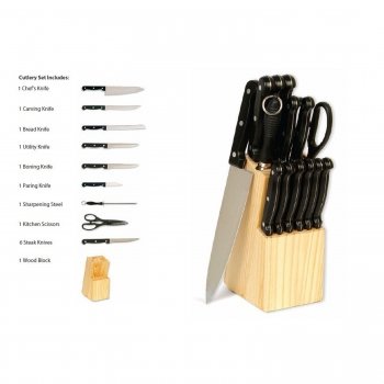 -. Feature : Set includes: 1 chef's knife ,1 carving knife ,1 bread knife ,1 utility knife ,1 boning knife ,1 paring knife ,1 sharpening steel ,1 kitchen scissors ,6 steak knives ,1 wood knife block. / Abs riveted handles / Dishwasher safe / Limited warranty