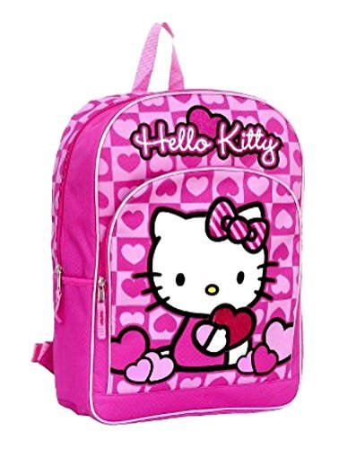 -. Feature : Adorable Hello Kitty backpack is sure to be a hit / Surrounded by two-toned pink hearts, the bow-wearing kitty is front and center on this charming pink backpack. It is the perfect size for school, day trips, or overnight / Large main compartment and front compartment with zipper closures / 2 side pockets and adjustable padded shoulder straps / Measures apprx 16" by 12"