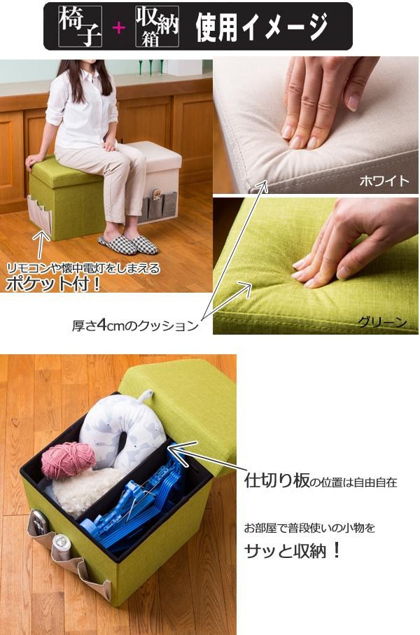 小物を収納できるイスです。リビングやオットマン、ドレッサーチェアや子供部屋など、あらゆる場面で活躍!!リモコンや懐中電灯などをしまえるポケットもついています。好きな位置に装着できる仕切り板付なので、箱の中もきちんと整頓できます。 |