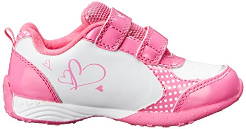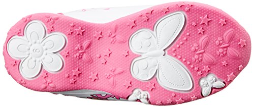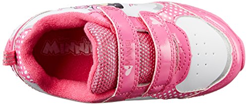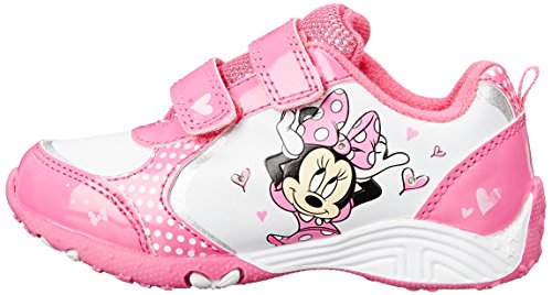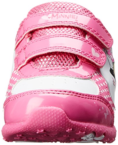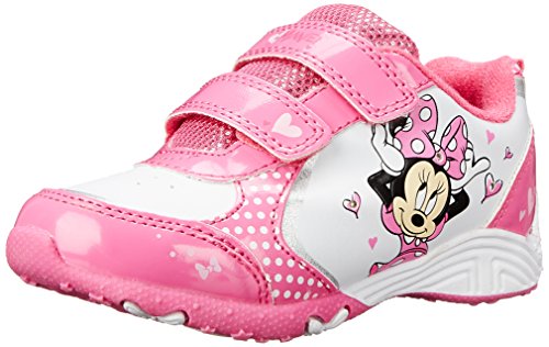 Item: Disney Minnie CH14289. - Upper: Faux Leather/Nylon. - Style:Kids' athletic fashion sneakers featuring faux leather uppers with double hook and loop enclosures - padded collar and tongue - nylon sport lining - patent gloss detail - character artwork with stomp-activated red LED lighting accents - and rubber outsole. - Sole: Rubber. - Heel: 1/2 inch heel. - Lining: Nylon. - Origin: Imported. - Colors: White/Fuchsia.Feature