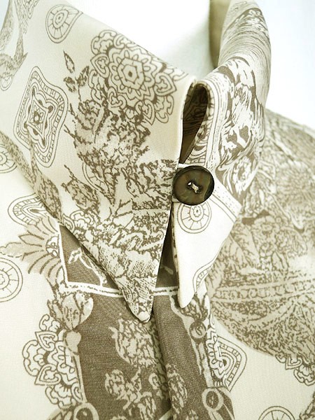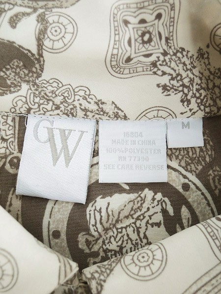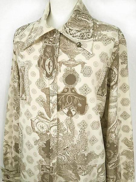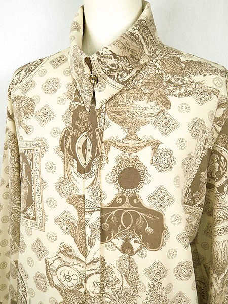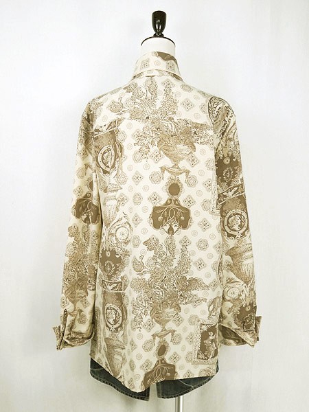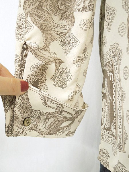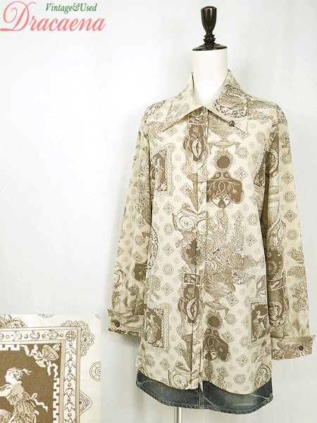 Ladies ブランド カラーベージュ・茶色 メール便不可 コンディション★★★ 素材ポリエステル100% 表記サイズM スタッフコメントヨーロピアンなプリントが素敵なシャツ。 少し大きめのサイズなので、 ボトムスはタイトなものやボトムインして着ると◎ 実寸サイズ 着丈 77 cm 身幅 54 cm 肩幅 43 cm 袖丈 63 cm スリット 12 cm ※ウエスト・ヒップ以外は平置き採寸