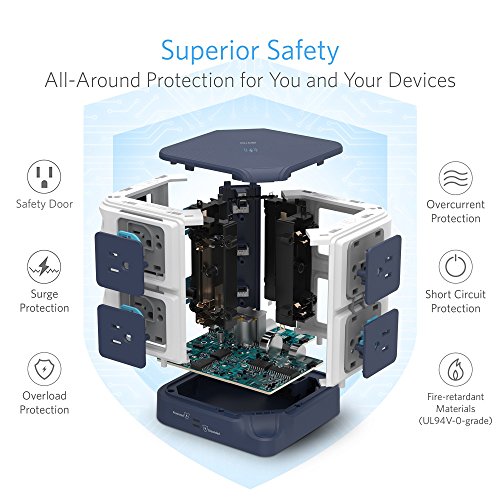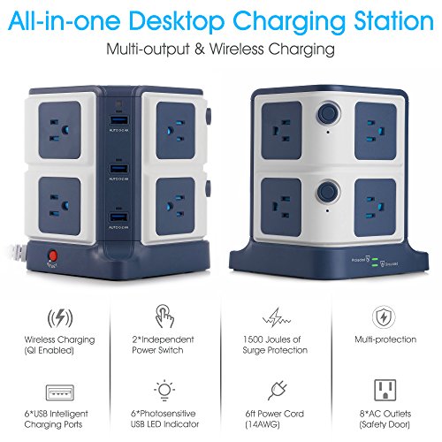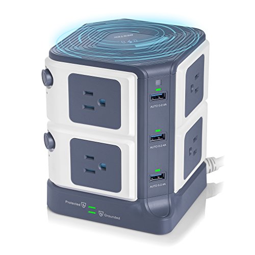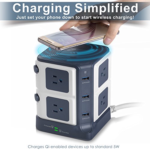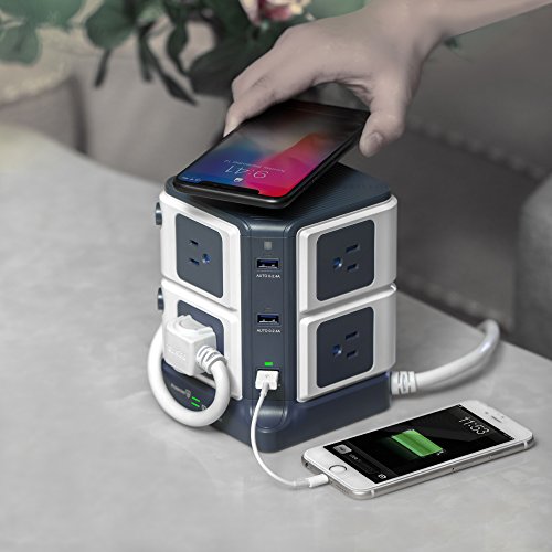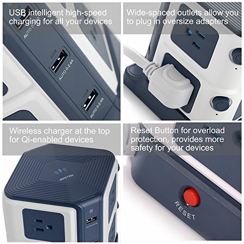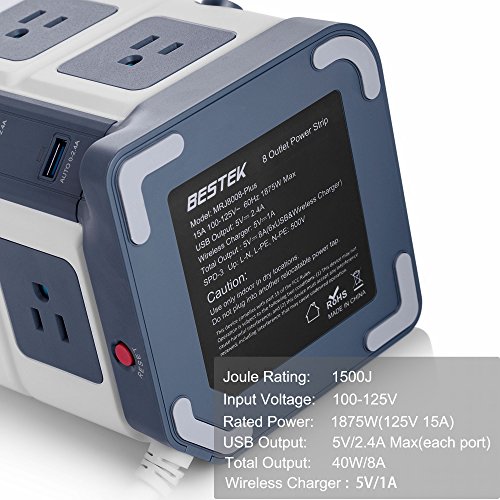 Studio : BESTEK Publisher : BESTEK Binding : Wireless Phone Accessory Product Description ★Exclusive Design -- USB Power Strip with Wireless Charger - ALL-IN-ONE: 8*AC Outlets 6*USB Charging Ports 1*Wireless Charger - A creative combination of wireless charger and power strip for all your devices! - BESTEK Wireless Charging USB Power Strip will provide an ideal solution for your messy desk,A SPACE SAVER! BESTEK 8-Outlet and 6-Port Surge Protector Wireless Charging USB Power Strip - 6 Smart USB Charging Ports with 40W/8A total output,provides plenty power for charging your multiple devices. - 8 surge protected outlets with SAFETY DOOR, protecting kids from unexpected electricity shock. - One built-in wireless charger for your Qi-enabled devices. - Two independent switches to make it easy to turn off the appliances when not in use,ENERGY SAVING! - USB LED indicator with photosensitive induction function can automatically adjust the brightness of the LED lights, offers?comfortable brightness(50%off)?especially when charging at night(no bright light will affect your sleep). PROTECT YOUR VALUABLE DEVICES FROM DAMAGE - 1500 Joules of Surge Protection. - Heavy-Duty Six-Foot Power Cord (14 AWG) ensures optimal power flow to your valuable devices. - Built-in short circuit, overload,over temperature and over current protection,fireproof V0-grade PC and ABS material. IMPORTANT NOTE Please take off the phone case if you have a metal phone case or your case has a metallic coating. SPECIFICATION - Input Voltage : 100-125V - AC Rated power: 1875W(125V 15A) - Surge Protection: 1500J - USB Output: 40W 8A(Total), 5V/2.4A Max(each port) - Wireless Charging: 5V/1A - Size/Weight: 4.8*4.8*5.7 in / 2.14 lb? - Cord length: 6 Feet (14AWG)? WORRY-FREE WARRANTY - 18 months worry-free product guarantee for every purchase 0