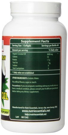 -. Binding : Health and Beauty -. Brand : Nutri Essentials -. Feature : Promoting your heart health -- Promoting weight loss when and if you need it / Supporting your immune system health -- upporting a healthy metabolism / Providing you with an immediate energy source -- Helping to keep your skin healthy and youthful looking / Supporting the proper functioning of your thyroid gland / Burning down of MCT's in the liver helps in efficient burning of energy which may help keep weight balanced -. Label : Nutri Essentials -. Manufacturer : Nutri Essentials -. ProductGroup : Health and Beauty -. ProductTypeName : HEALTH_PERSONAL_CARE -. Publisher : Nutri Essentials -. Studio : Nutri Essentials -. Title : Nutri Essentials Extra Virgin & Organic Coconut Oil 3000 Mg Per Serving