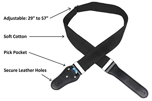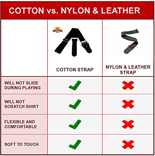 - Feature : SOFT COTTON- Will not slide or cut into your body like nylon or leather electric guitar strap / FOR ALL AGES AND SIZES- Adjustable from 29" (73 cm) to 57" (145 cm) acoustic guitar strap. / NEW DESIGN- Secure leather holes and bonus pick pocket makes it great adults or kids guitar strap. / CLASSICAL GUITAR STRAP- No logos, gimmicks and oriental gibberish to suit everyone's tastes. / 100% SATISFACTION GUARANTEED- best quality of all acoustic guitars straps.