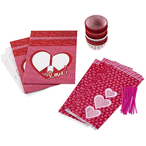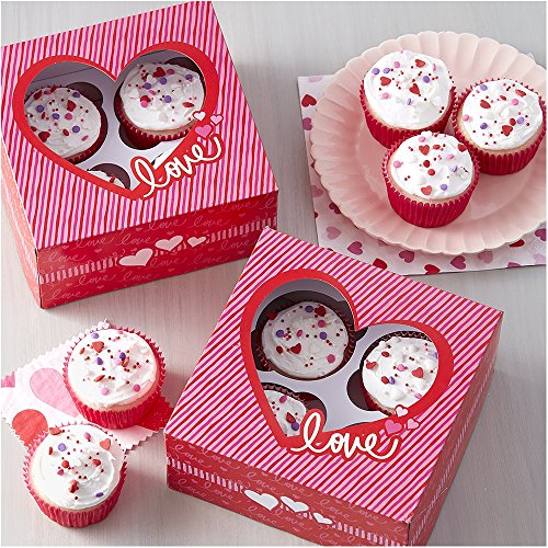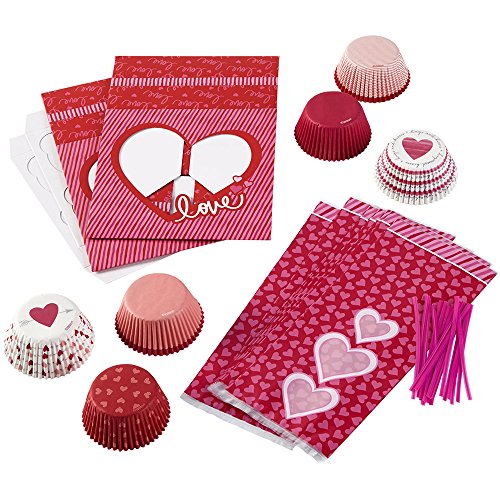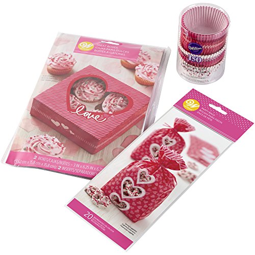 - Includes these Wilton products: 150-count Valentine's Day cupcake liners, 2-count package of 'Love' cupcake boxes and 20 red with pink hearts treat bags with ties